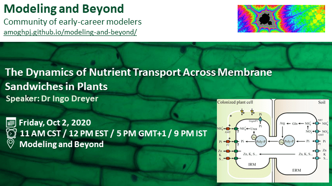 This Friday, 10/2 we will be having a special meeting to talk with Dr Ingo Dreyer about his work on modeling membrane transporters. He uses his physics background, and ODE models and modeling platforms like VCell, to show what possible combinations of membrane transporters are possible given the experimental observations of the mutualistic system between plants and their microbiome.